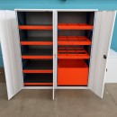 Металлические выдвижные лотки рассчитаны на длительную эксплуатацию под высокими нагрузками, обеспечивая удобный доступ к хранимым элементам.
